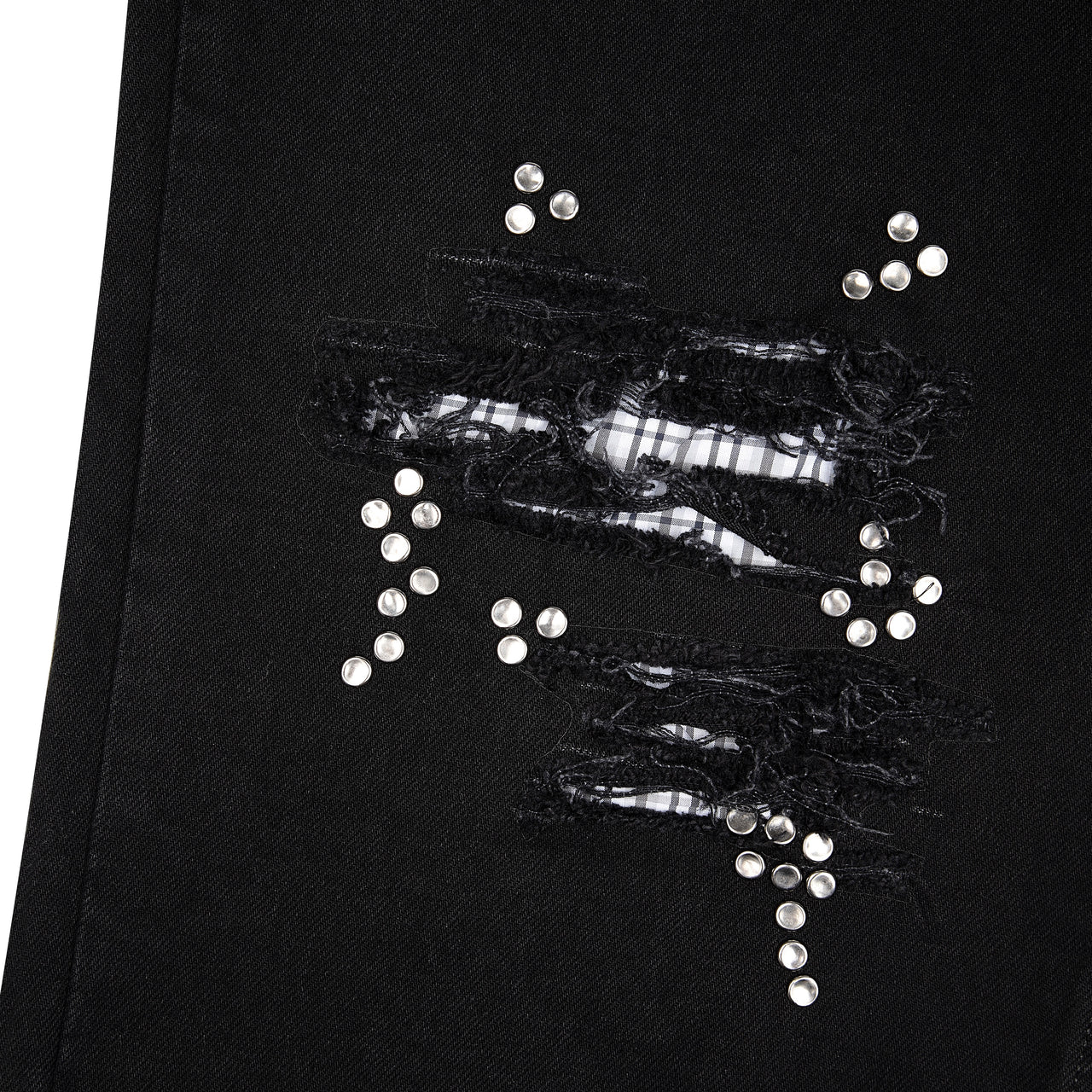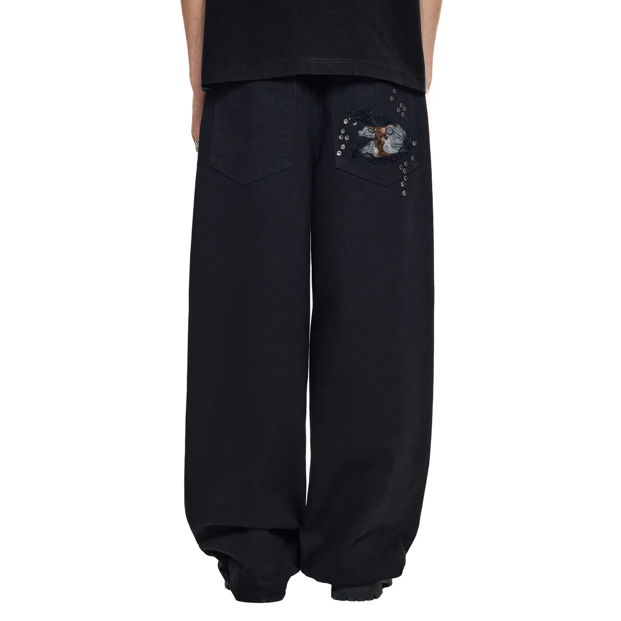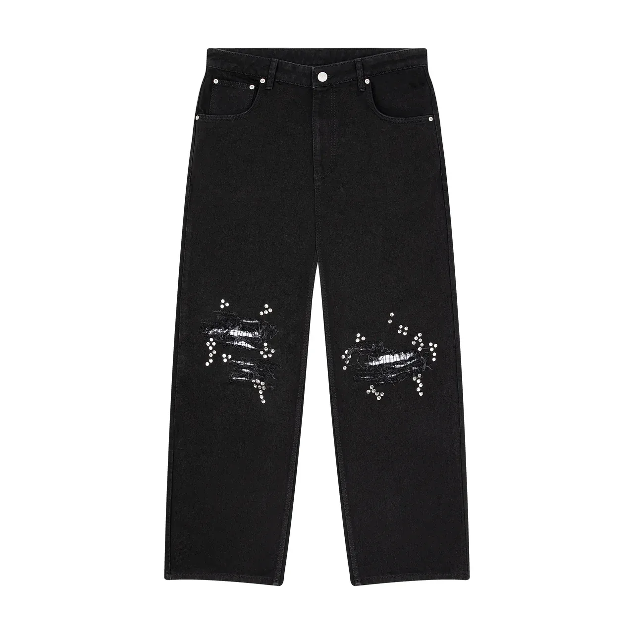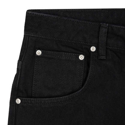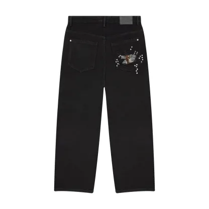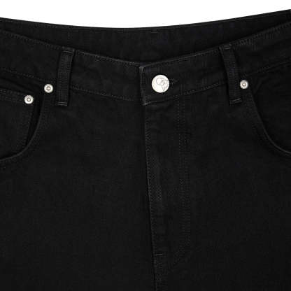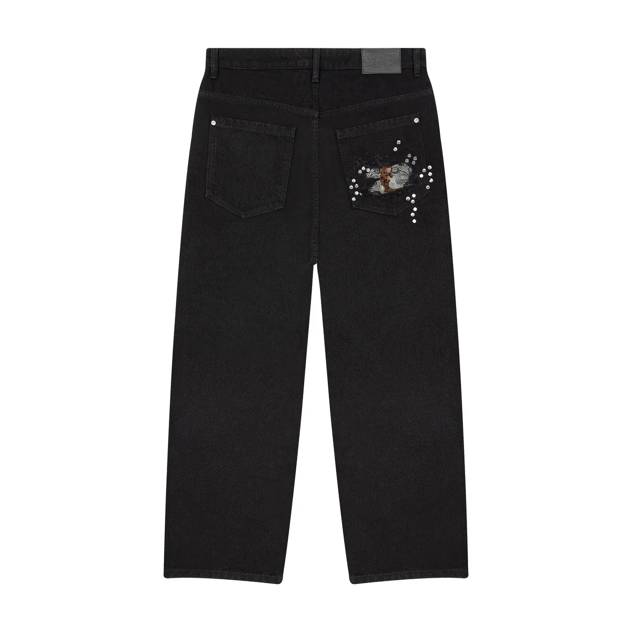14,5oz denim / 100% cotton / distressed and patched at knees and back pocket / embroidery on back pocket patch / button studs at knees and back pocket / debossed printed leather patch / custom button / wash inside out / fits true to size