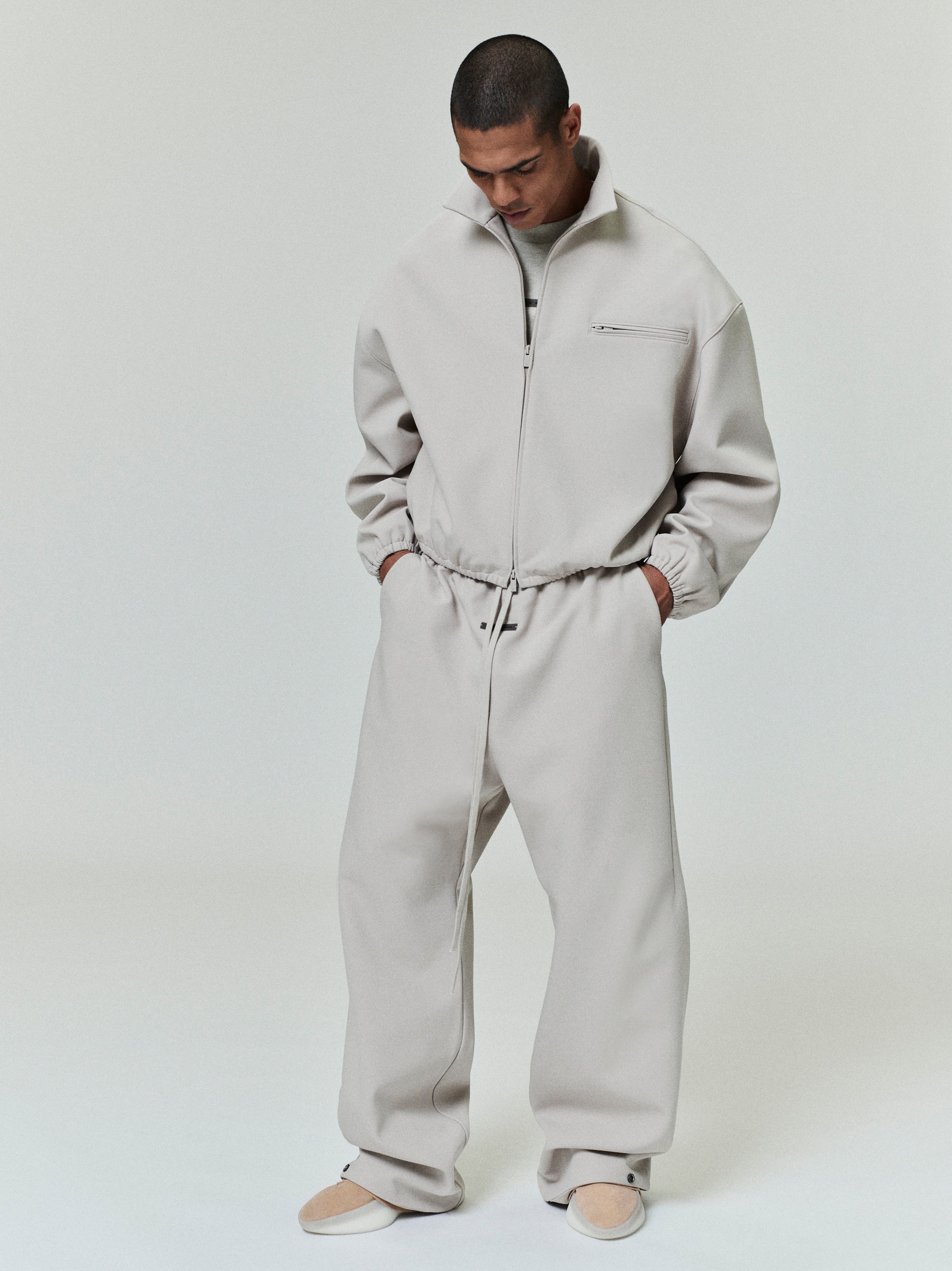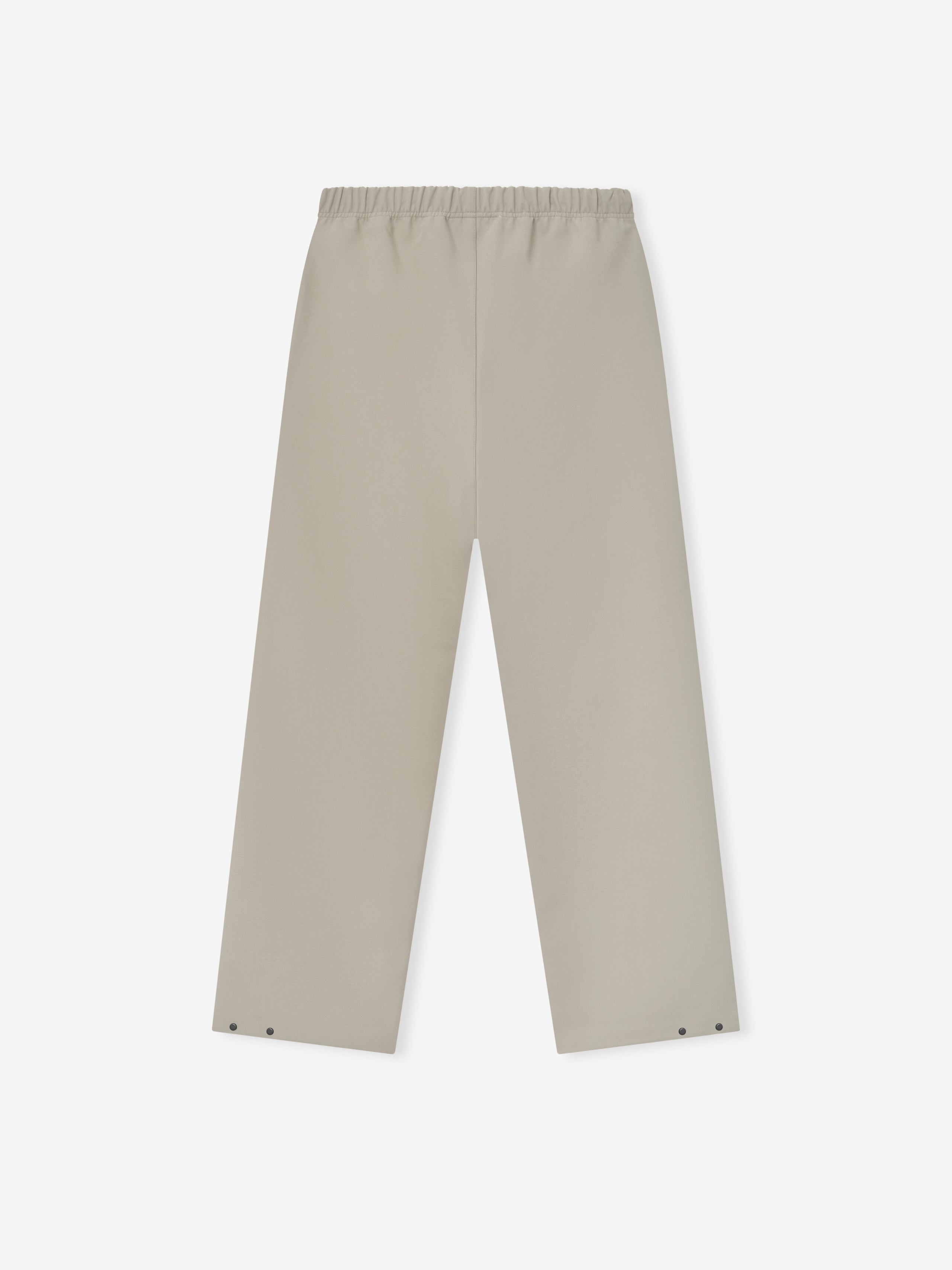 The Bonded Canvas Work Pant is crafted from a bonded stretch fabric that provides modern comfort while showcasing a workwear-inspired style. This loose leg fit features side pockets, an encased elastic waistband with drawstrings, and metal snap hardware at the bottom hem. Additionally, a "Fear of God Essentials" rubberized label is stitched at the center front.