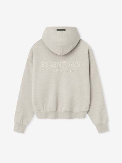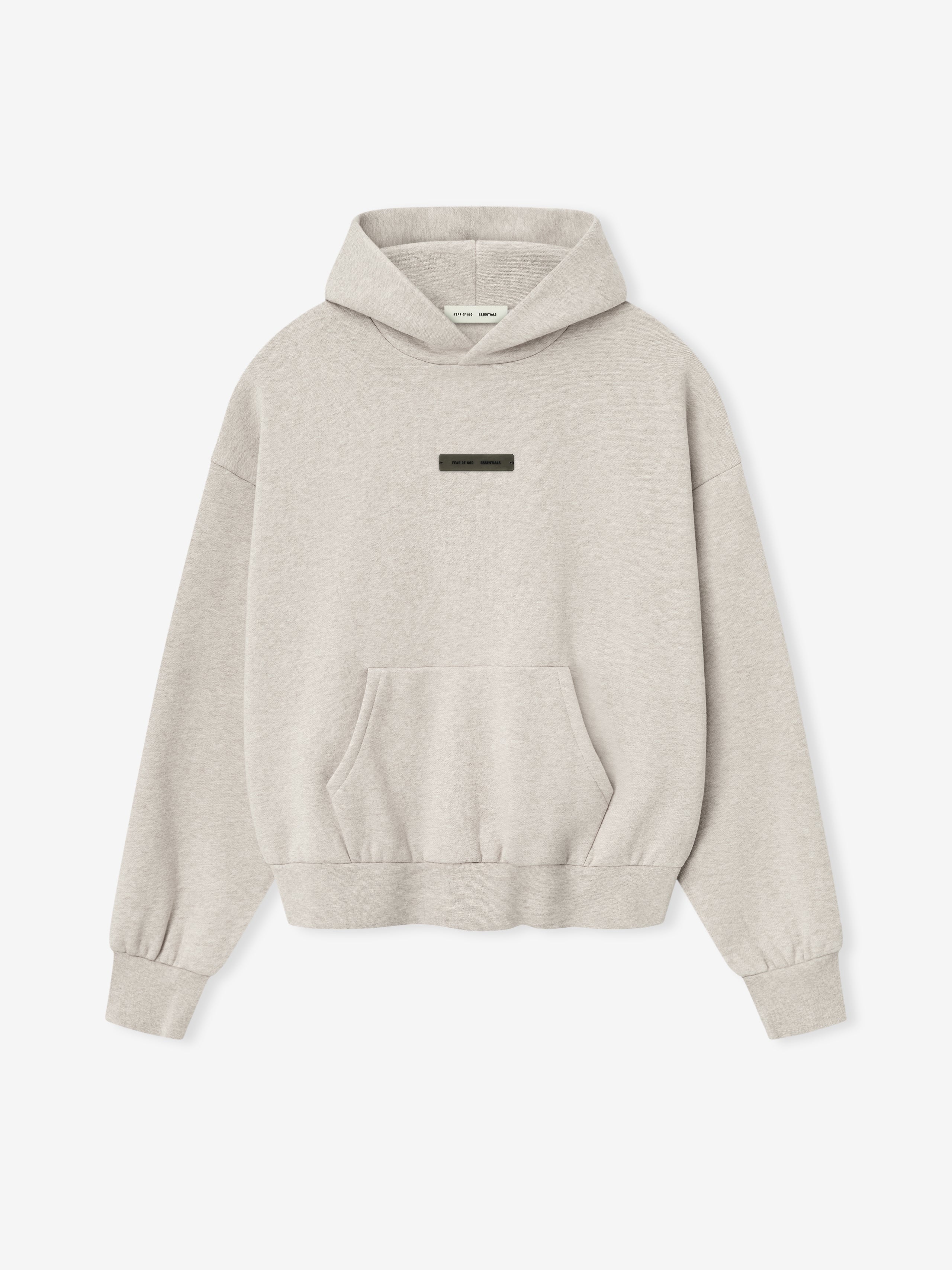 The Classic Hoodie is made from 380gsm core fleece to provide ideal comfort and structure. The hoodie features a classic fit with signature Fear of God relaxed proportions. A new "Essentials Fear of God" beveled metallic logo is branded across the back. Details include a double-layer hoodie, kangaroo pocket, rib-knit cuffs and waist-hem. A "Fear of God Essentials" rubberized label is stitched on the hood and sleeve.
