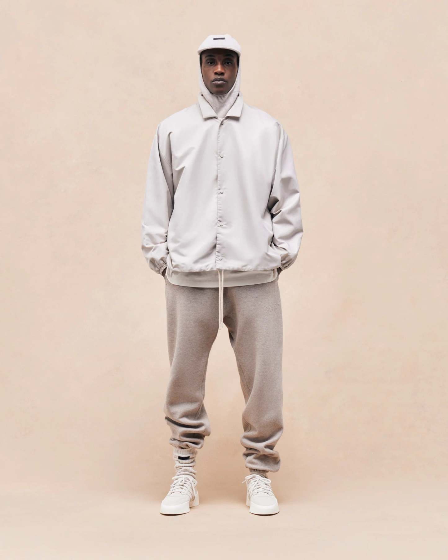 The Essentials coach jacket is made in a Taslan nylon and takes cues from the original sports style. The Essentials Fear of God logo on the back is vintage-inspired but updated in a rubberized soft-touch applique. Additional details include a shirt collar, snap button closure, side seam pockets, elasticated cuffs, and drawstring at the waist hem. A Fear of God rubberized label is at the back collar.
